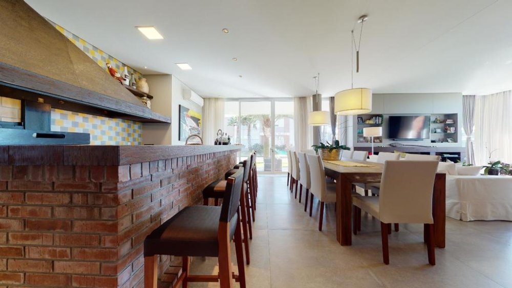 Amplo living no térreo com lareira revestida em madeira, lavabo, sala de jantar para 12 pessoas, gourmet integrado com parrilla Uruguaia, suite térrea master com 32m², cozinha fechada e área de serviçoo com dependência de empregada completa. Segundo pavimento possui ambiente intimo com mesa de sinuca e sala de TV, 4 dormitórios, sendo 2 suítes, e banheiro social.