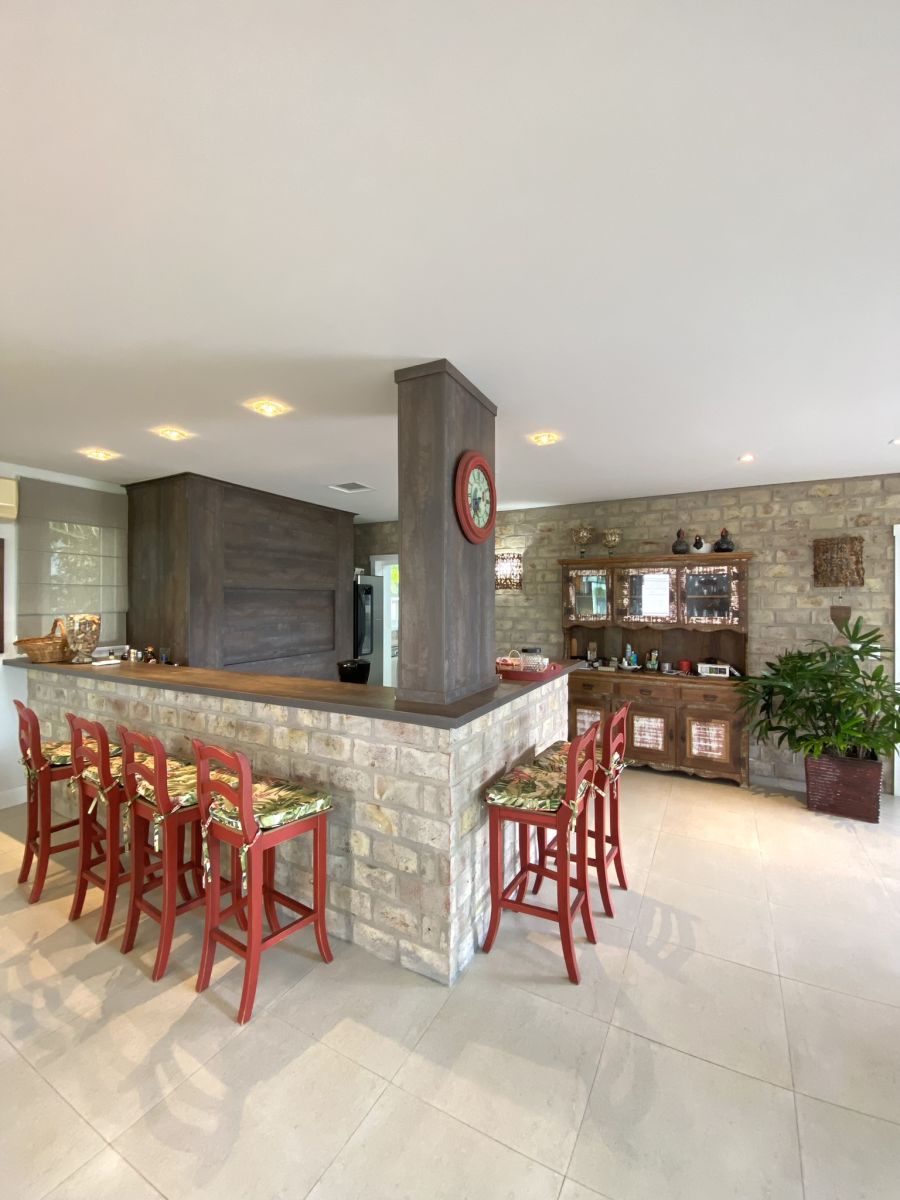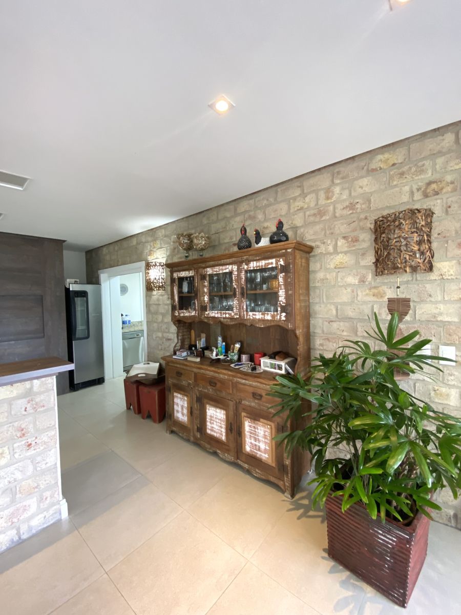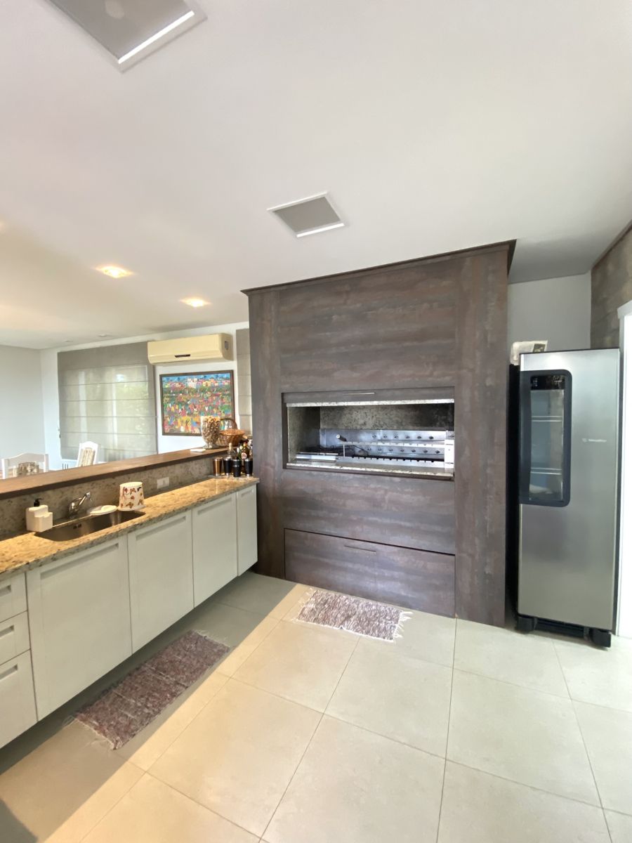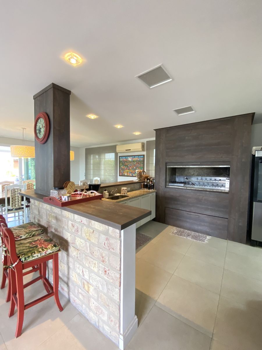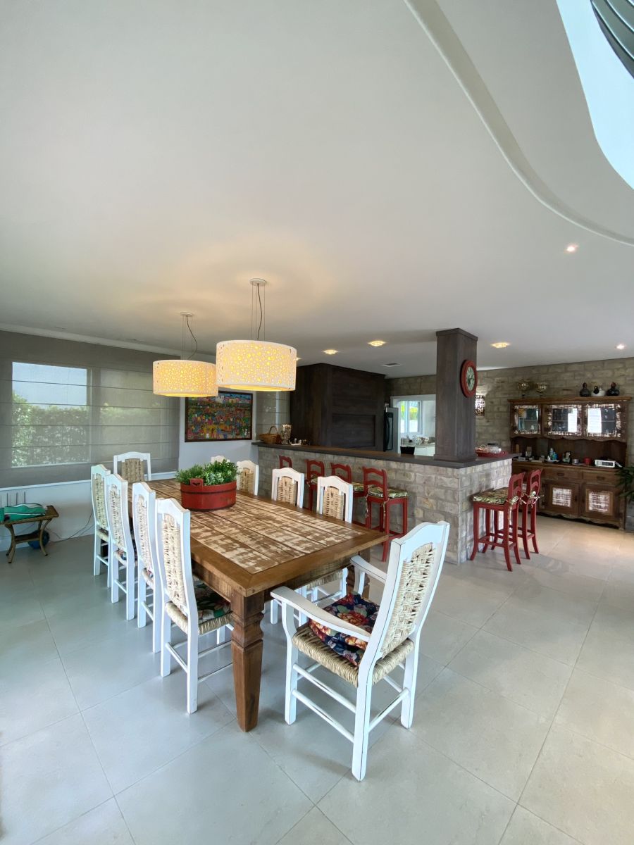 Amplo living no térreo com lareira revestida em madeira, lavabo, sala de jantar para 12 pessoas, gourmet integrado com parrilla Uruguaia, suite térrea master com 32m², cozinha fechada e área de serviçoo com dependência de empregada completa. Segundo pavimento possui ambiente intimo com mesa de sinuca e sala de TV, 4 dormitórios, sendo 2 suítes, e banheiro social.