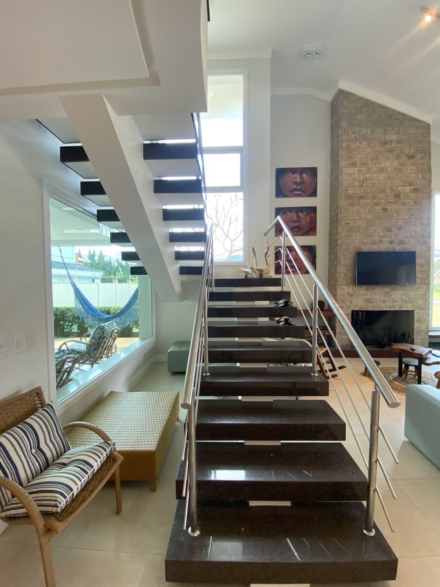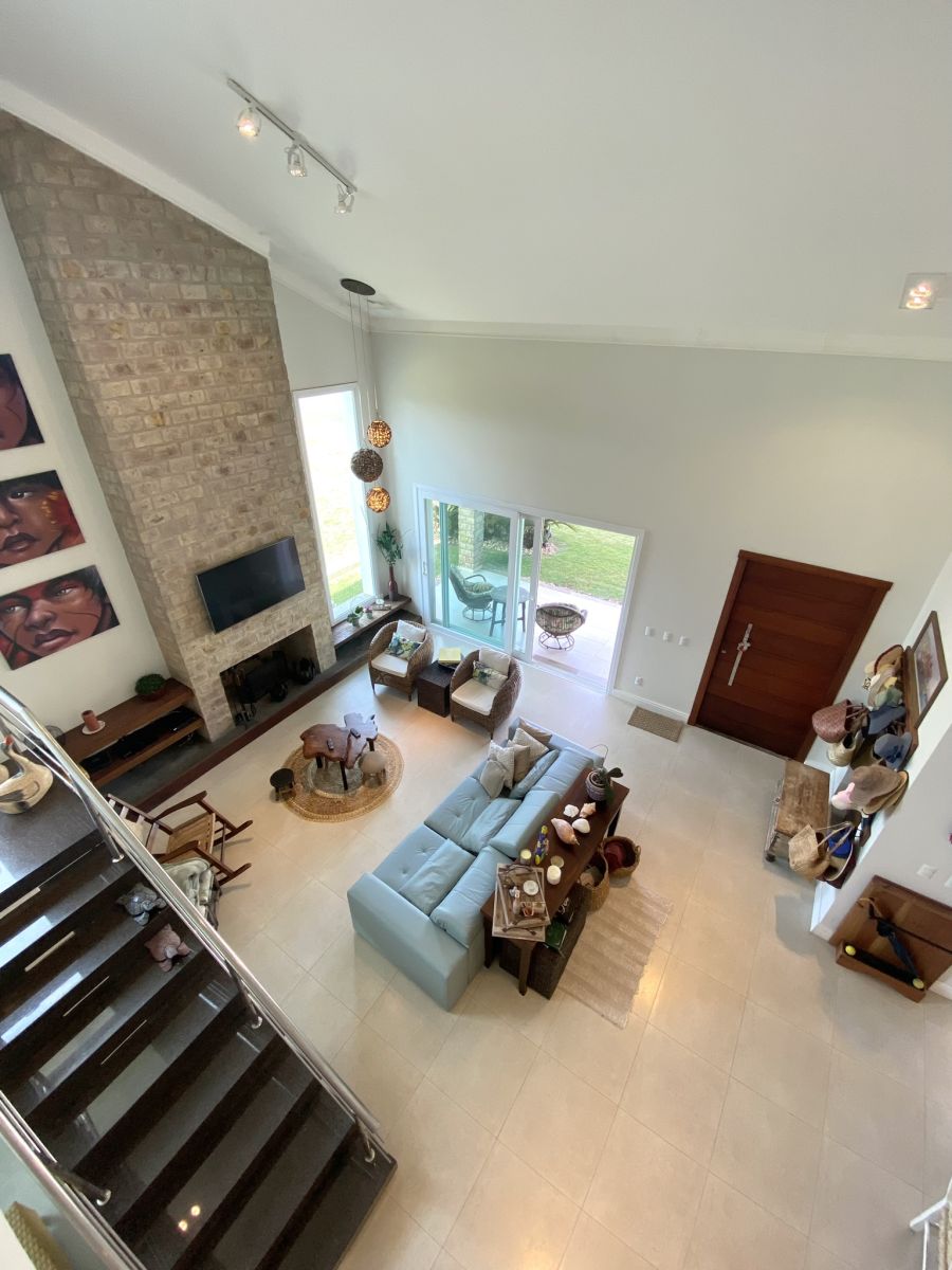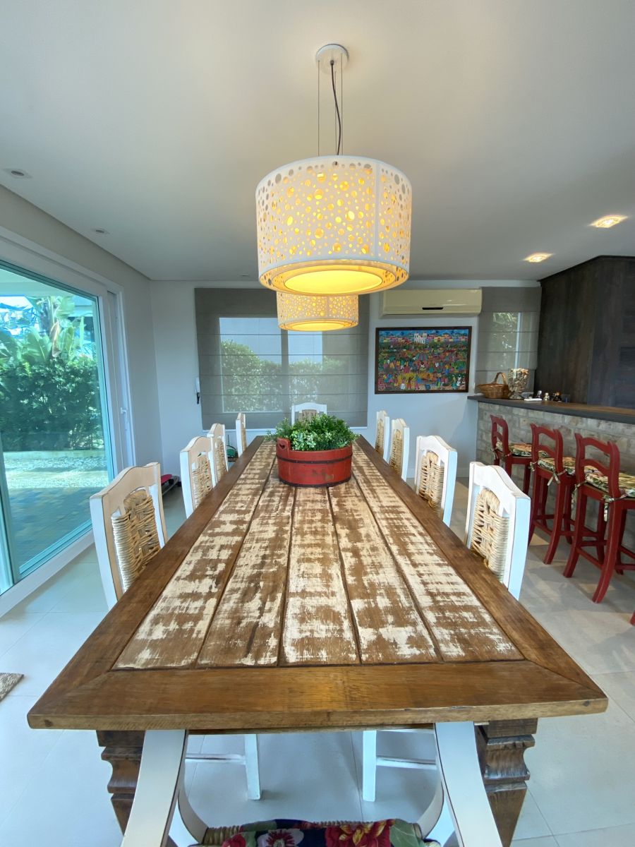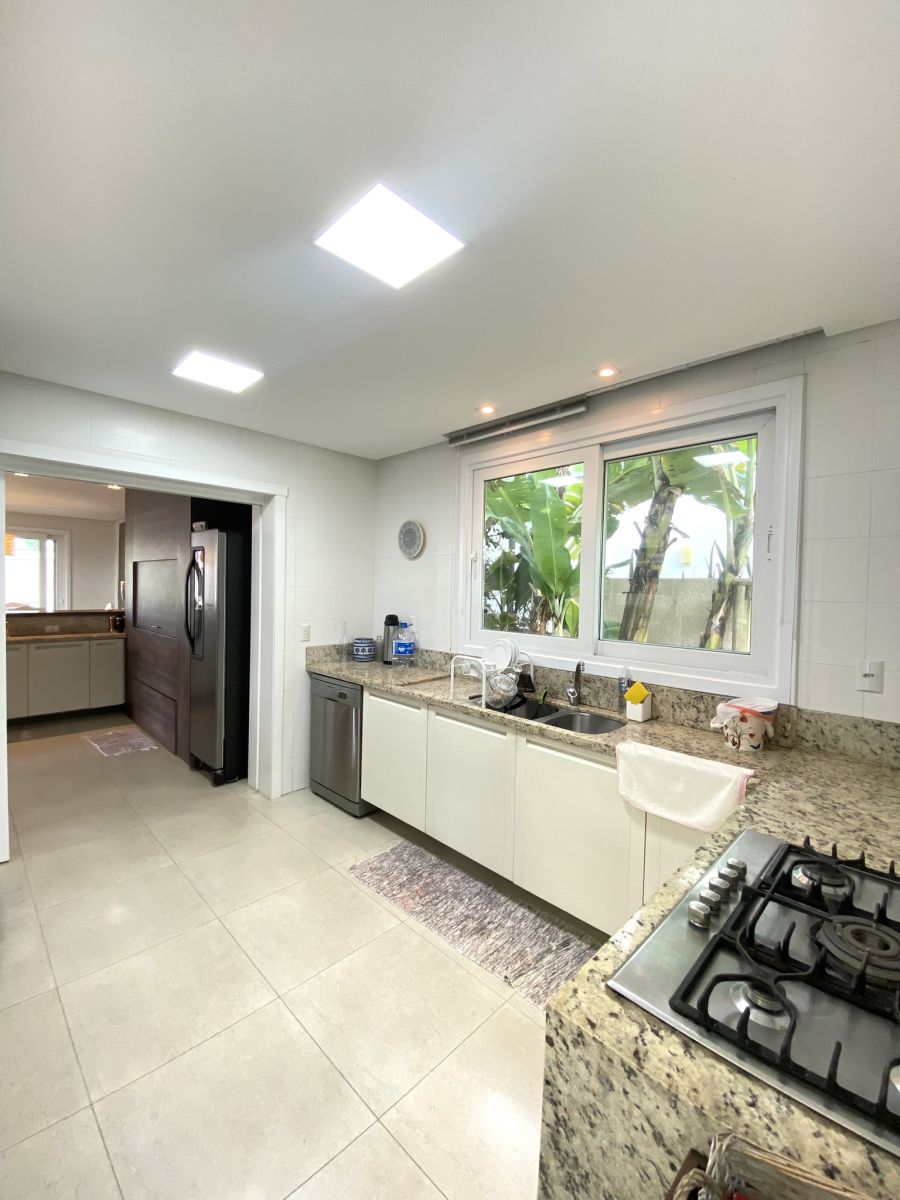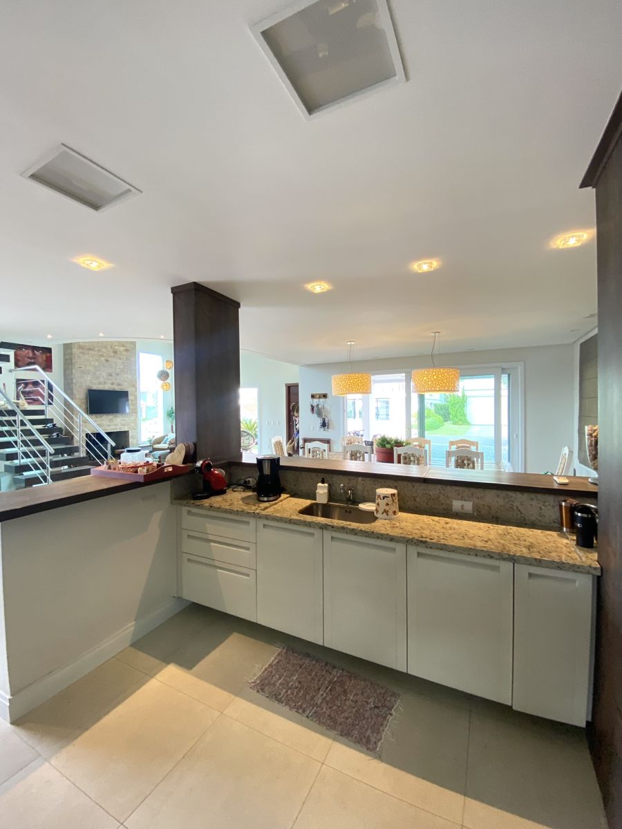 Amplo living no térreo com lareira revestida em madeira, lavabo, sala de jantar para 12 pessoas, gourmet integrado com parrilla Uruguaia, suite térrea master com 32m², cozinha fechada e área de serviçoo com dependência de empregada completa. Segundo pavimento possui ambiente intimo com mesa de sinuca e sala de TV, 4 dormitórios, sendo 2 suítes, e banheiro social.