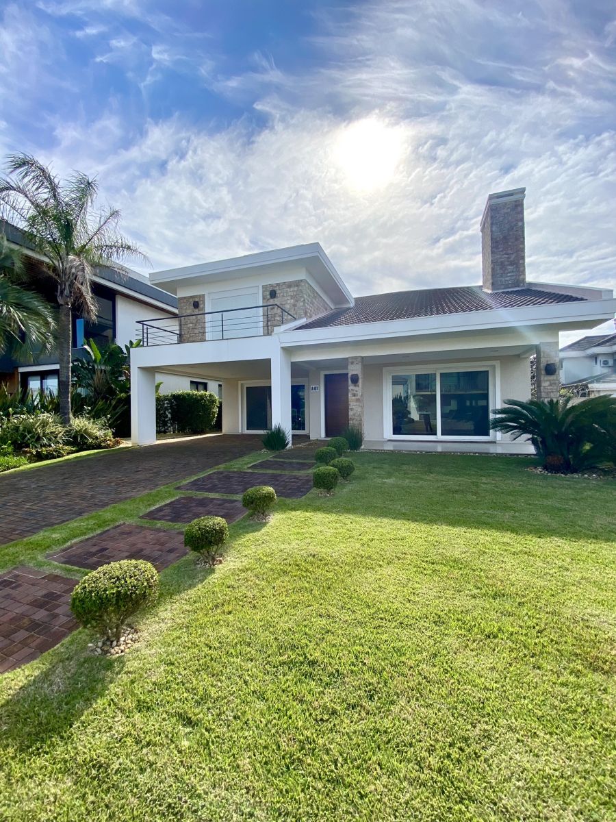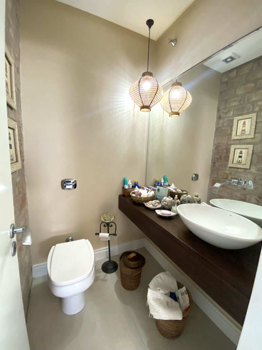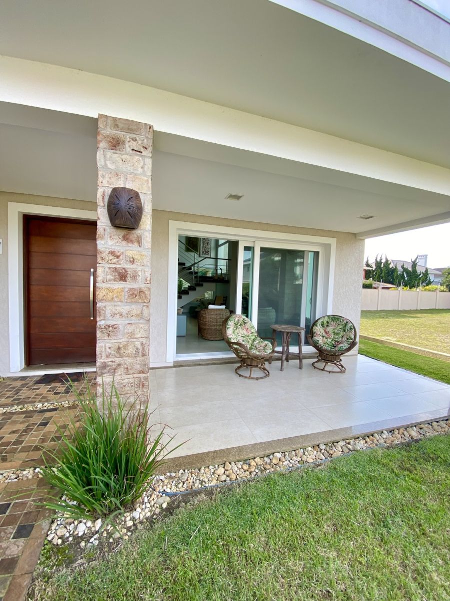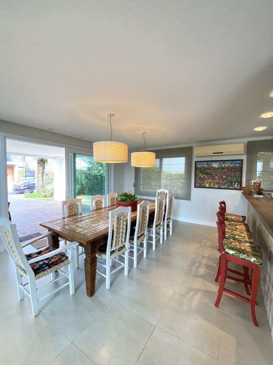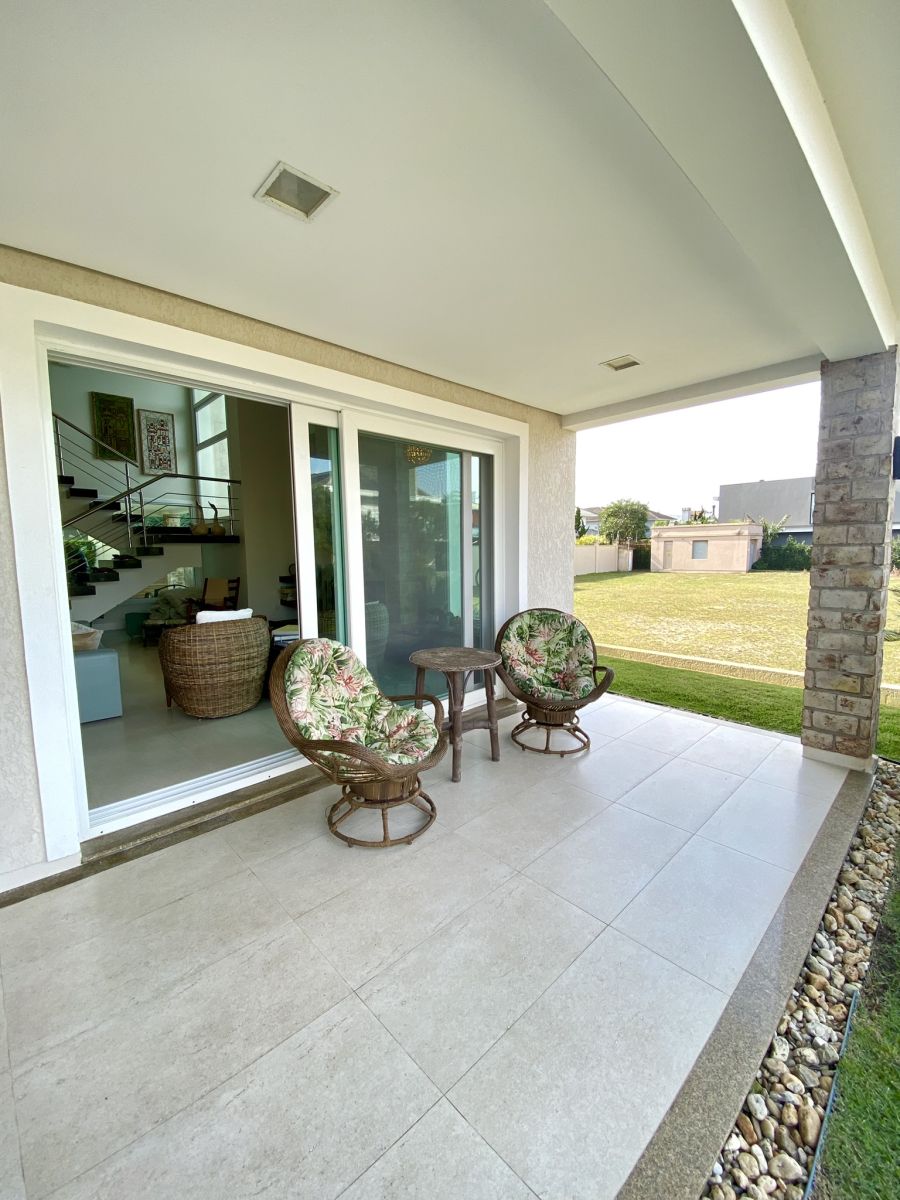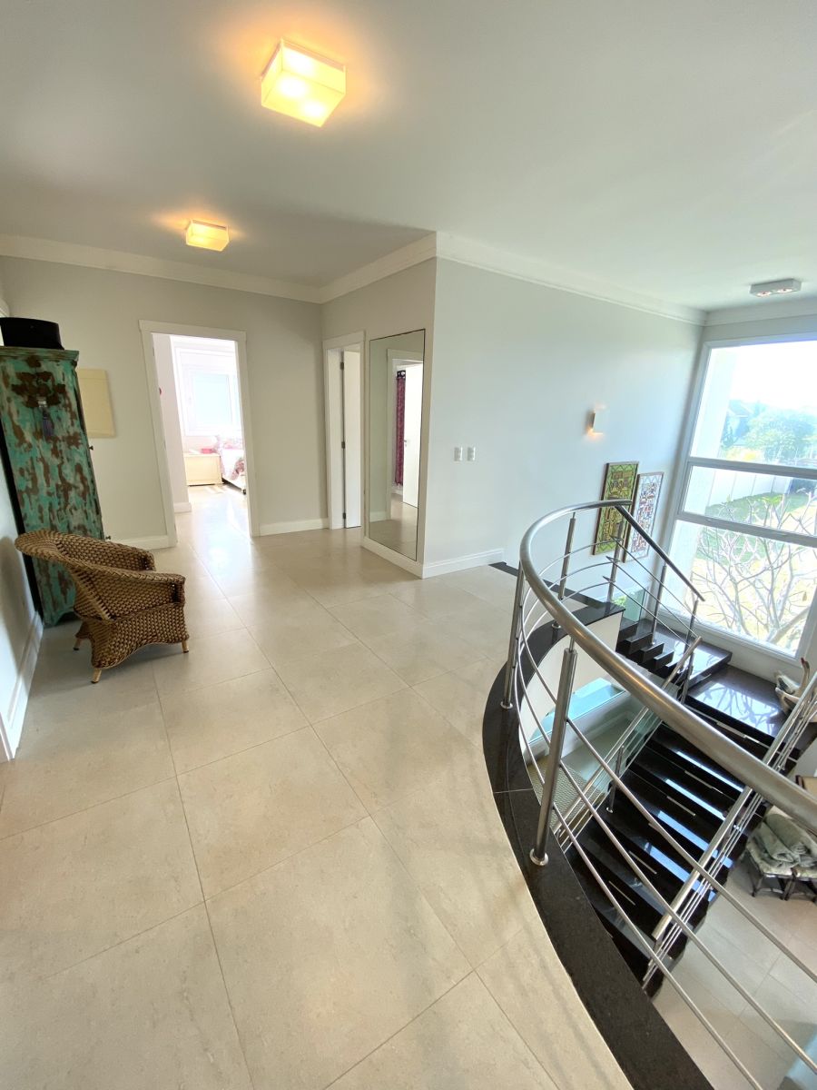 Amplo living no térreo com lareira revestida em madeira, lavabo, sala de jantar para 12 pessoas, gourmet integrado com parrilla Uruguaia, suite térrea master com 32m², cozinha fechada e área de serviçoo com dependência de empregada completa. Segundo pavimento possui ambiente intimo com mesa de sinuca e sala de TV, 4 dormitórios, sendo 2 suítes, e banheiro social.