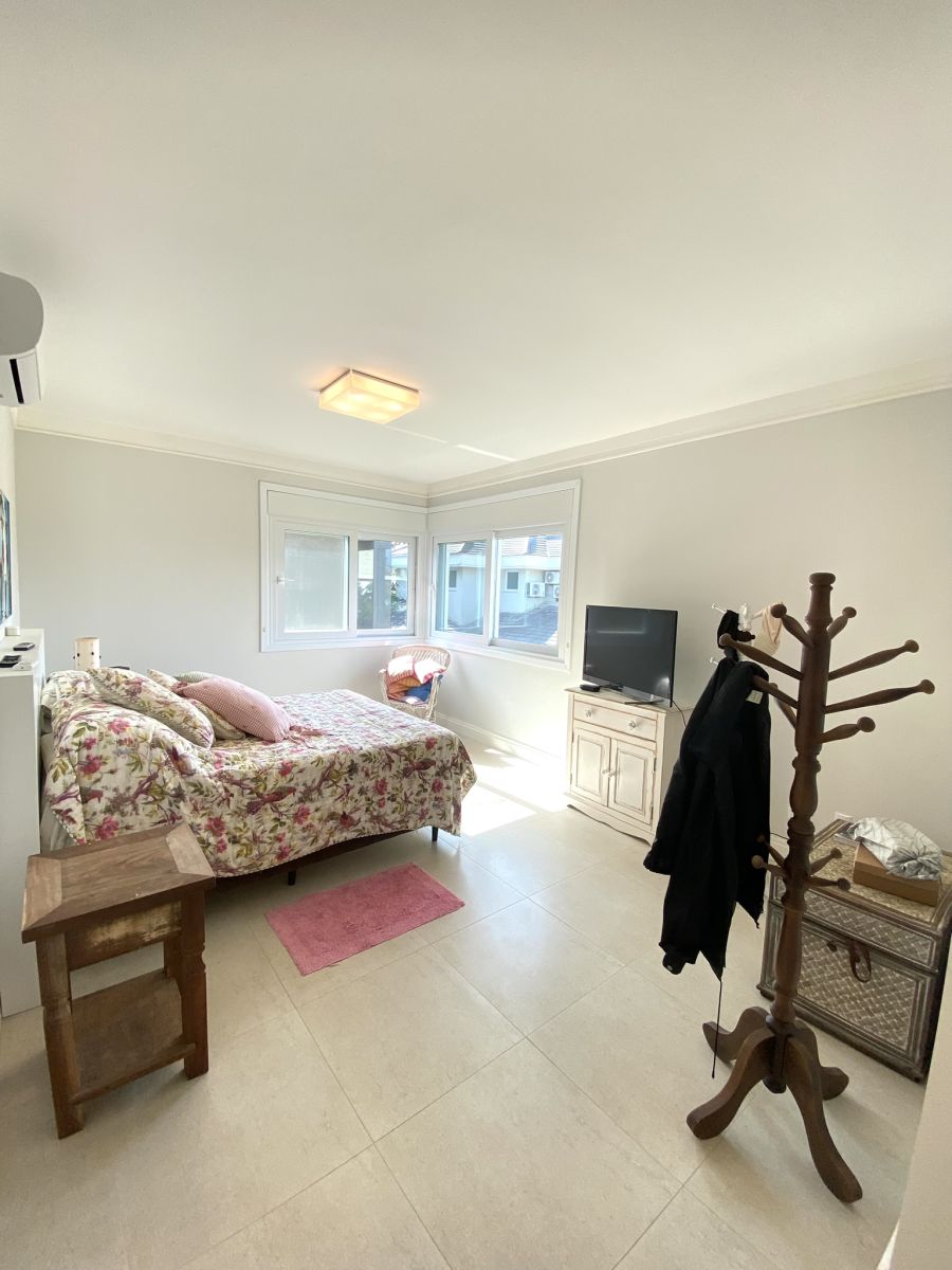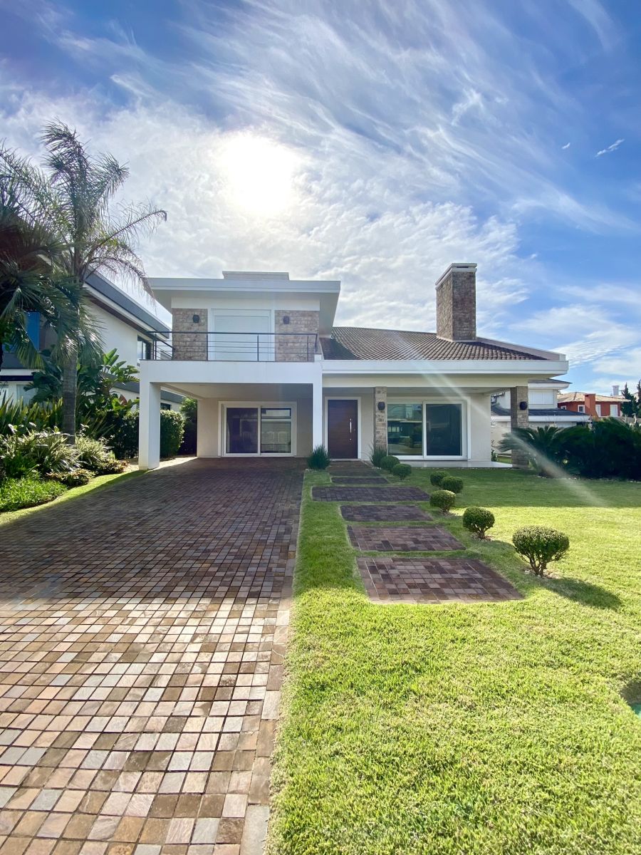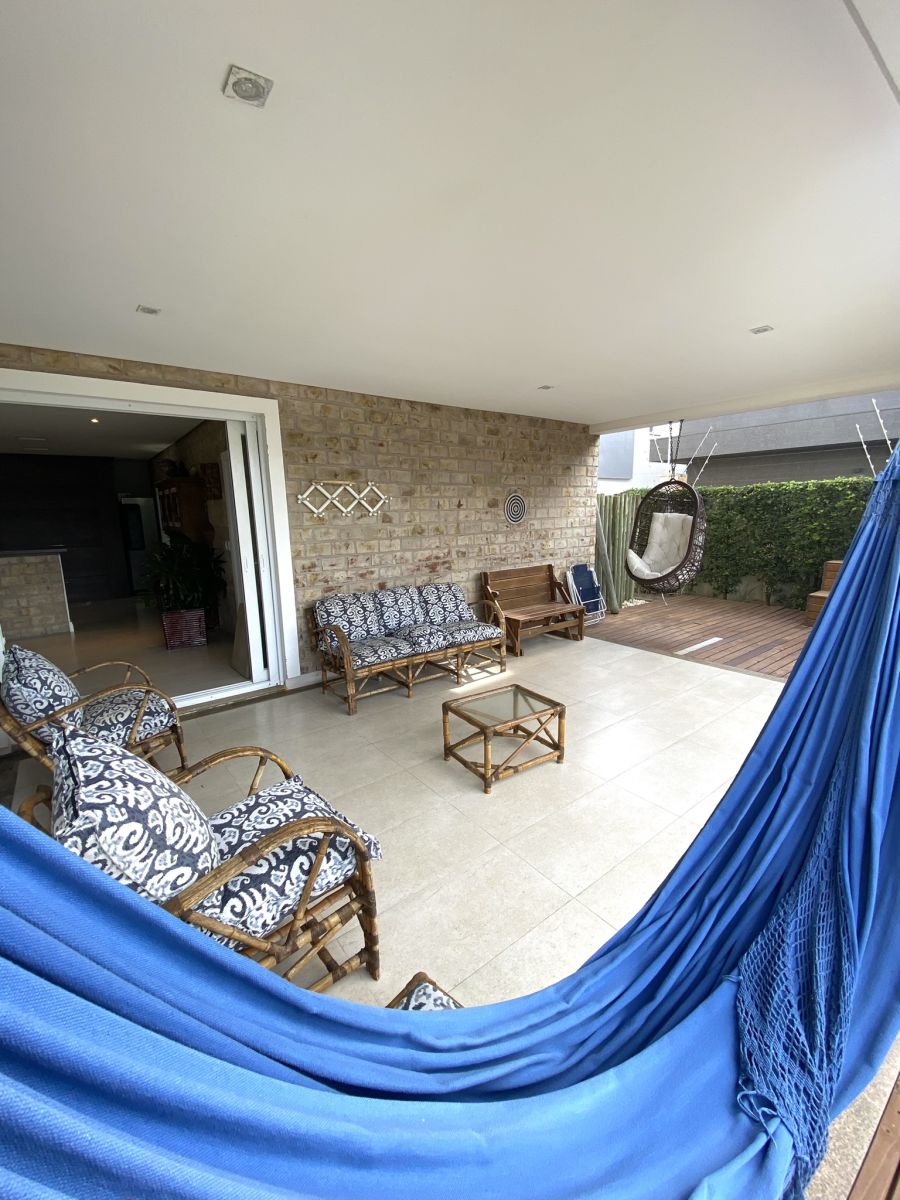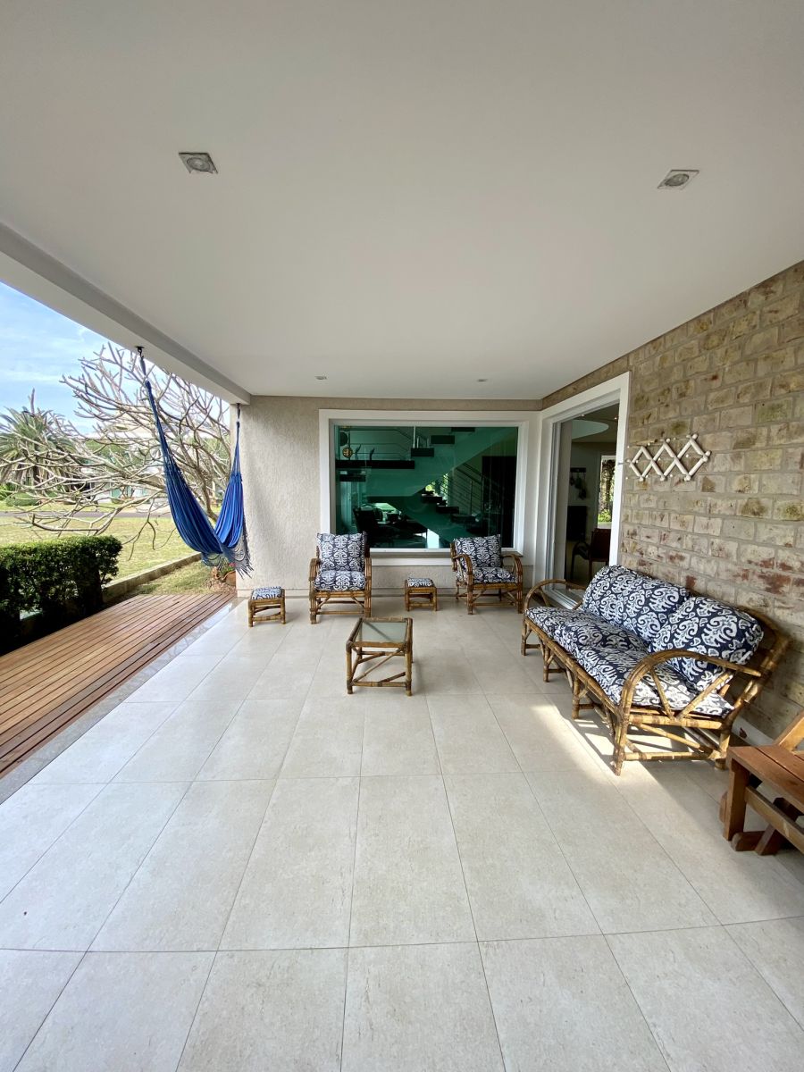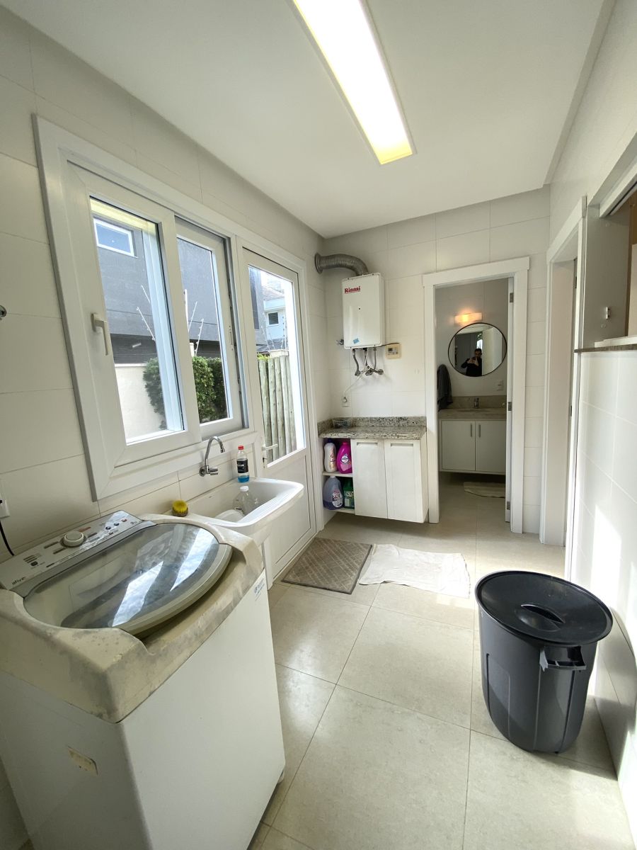 Amplo living no térreo com lareira revestida em madeira, lavabo, sala de jantar para 12 pessoas, gourmet integrado com parrilla Uruguaia, suite térrea master com 32m², cozinha fechada e área de serviçoo com dependência de empregada completa. Segundo pavimento possui ambiente intimo com mesa de sinuca e sala de TV, 4 dormitórios, sendo 2 suítes, e banheiro social.