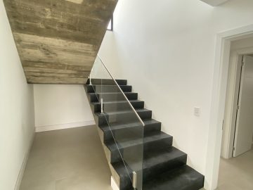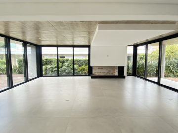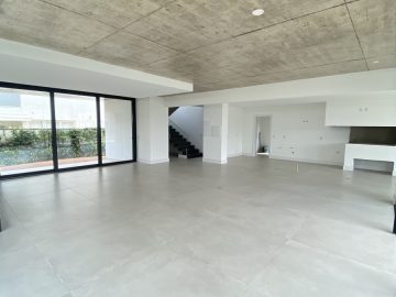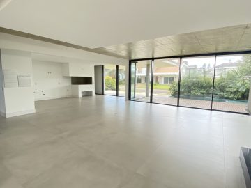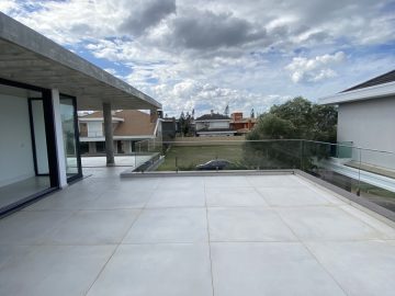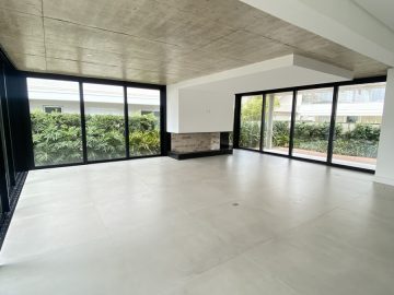 Amplo living no térreo com lareira revestida em madeira, lavabo, sala de jantar para 12 pessoas, gourmet integrado com parrilla Uruguaia, suite térrea master com 32m², cozinha fechada e área de serviçoo com dependência de empregada completa. Segundo pavimento possui ambiente intimo com mesa de sinuca e sala de TV, 4 dormitórios, sendo 2 suítes, e banheiro social.