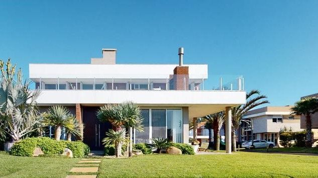 Amplo living no térreo com lareira revestida em madeira, lavabo, sala de jantar para 12 pessoas, gourmet integrado com parrilla Uruguaia, suite térrea master com 32m², cozinha fechada e área de serviçoo com dependência de empregada completa. Segundo pavimento possui ambiente intimo com mesa de sinuca e sala de TV, 4 dormitórios, sendo 2 suítes, e banheiro social.