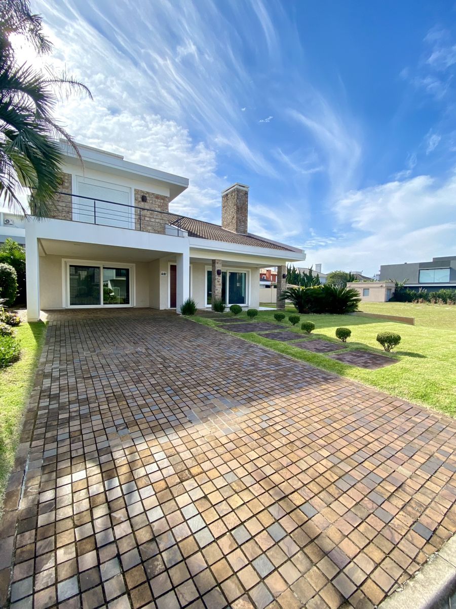 Amplo living no térreo com lareira revestida em madeira, lavabo, sala de jantar para 12 pessoas, gourmet integrado com parrilla Uruguaia, suite térrea master com 32m², cozinha fechada e área de serviçoo com dependência de empregada completa. Segundo pavimento possui ambiente intimo com mesa de sinuca e sala de TV, 4 dormitórios, sendo 2 suítes, e banheiro social.